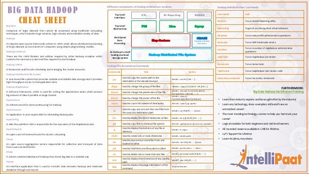 This cheat sheet outlines some of the main Hadoop commands that weve found useful as well as Kognitio specific commands when used on Hadoop. Data Definition Language DDL. Hdfs dfs -ls -d hadoop Directories are listed as plain files.